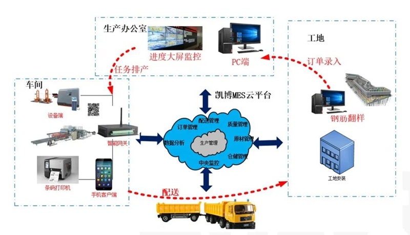 并且,凱博科技攜手中國(guó)鐵道科學(xué)研究院集團(tuán)有限公司,開(kāi)發(fā)凱博鋼筋加工管理軟件系統(tǒng)和鋼筋加工遠(yuǎn)程控制系統(tǒng),打造智能控制中心。鋼筋加工管理軟件系統(tǒng)以鋼筋加工過(guò)程中物資流管理為核心,借助工業(yè)互聯(lián)網(wǎng)、云服務(wù)、智能設(shè)備等技術(shù)手段,實(shí)現(xiàn)多項(xiàng)目多任務(wù)遠(yuǎn)程訂單管理,實(shí)現(xiàn)訂單排產(chǎn)、生產(chǎn)訂單分發(fā)、生產(chǎn)標(biāo)牌打印、成品完成報(bào)工,成品出入庫(kù)等功能,同時(shí)能夠以電子大屏實(shí)現(xiàn)項(xiàng)目訂單動(dòng)態(tài)實(shí)時(shí)監(jiān)控、加工廠整體運(yùn)營(yíng)狀態(tài)的中心化顯示。鋼筋加工遠(yuǎn)程控制系統(tǒng),可實(shí)時(shí)顯示加工場(chǎng)各種設(shè)備生產(chǎn)狀態(tài),同時(shí)實(shí)現(xiàn)中控室對(duì)現(xiàn)場(chǎng)設(shè)備啟動(dòng)和停止的遠(yuǎn)程控制,造就了高鐵梁場(chǎng)鋼筋加工數(shù)字化新模式!